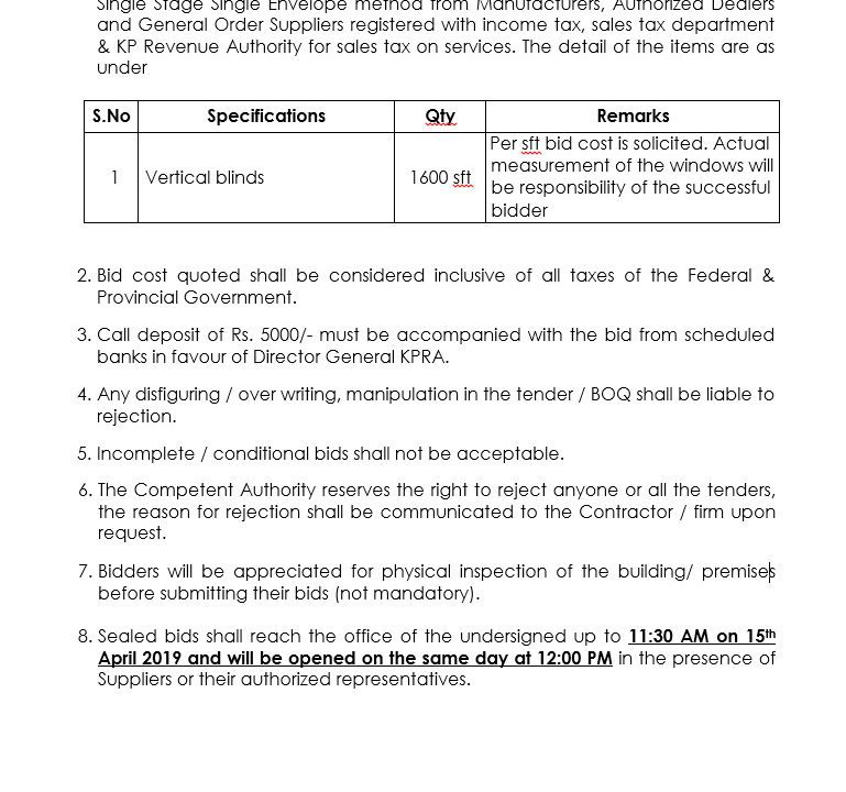April 16, 2019Published by KPRA Administrator on April 16, 2019Categories NewsTender Notice: Purchase & Installation of Vertical BlindsA Registration Week of KPRA, launched for taxpayers’ facilitation and tax acculturation in Khyber Pakhtunkhwa, concluded in Charsadda on Friday.