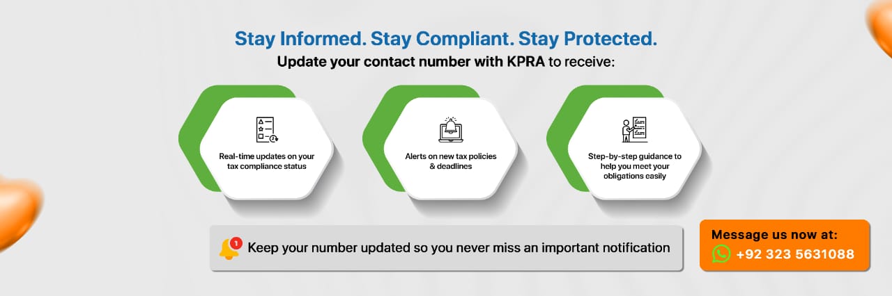 We will be sending messages to our taxpayers through the following WhatsApp number: 0323-5631088. Please save this number in your contacts and share your WhatsApp number with us on the same number to receive regular updates from Khyber Pakhtunkhwa Revenue Authority – KPRA.