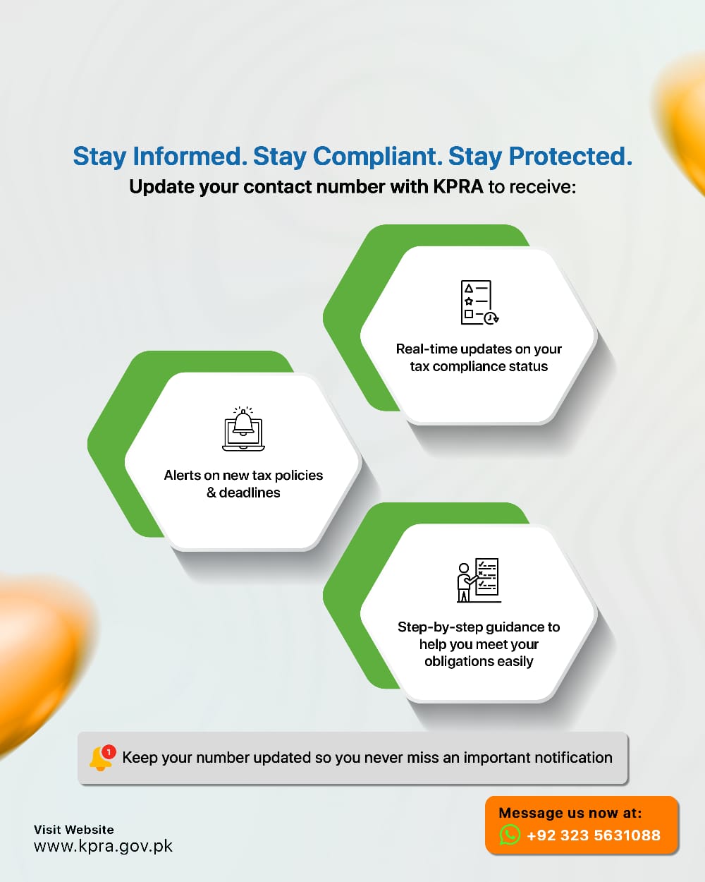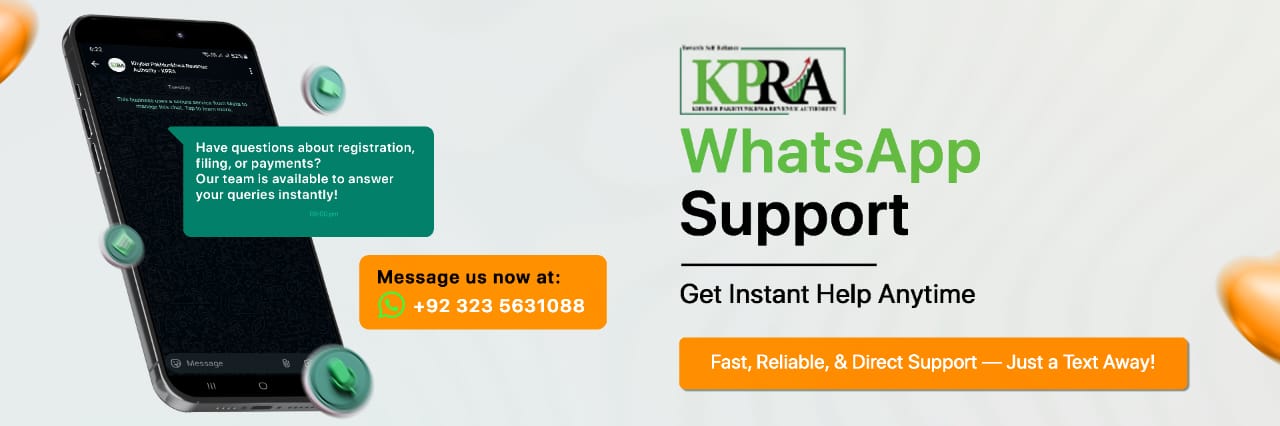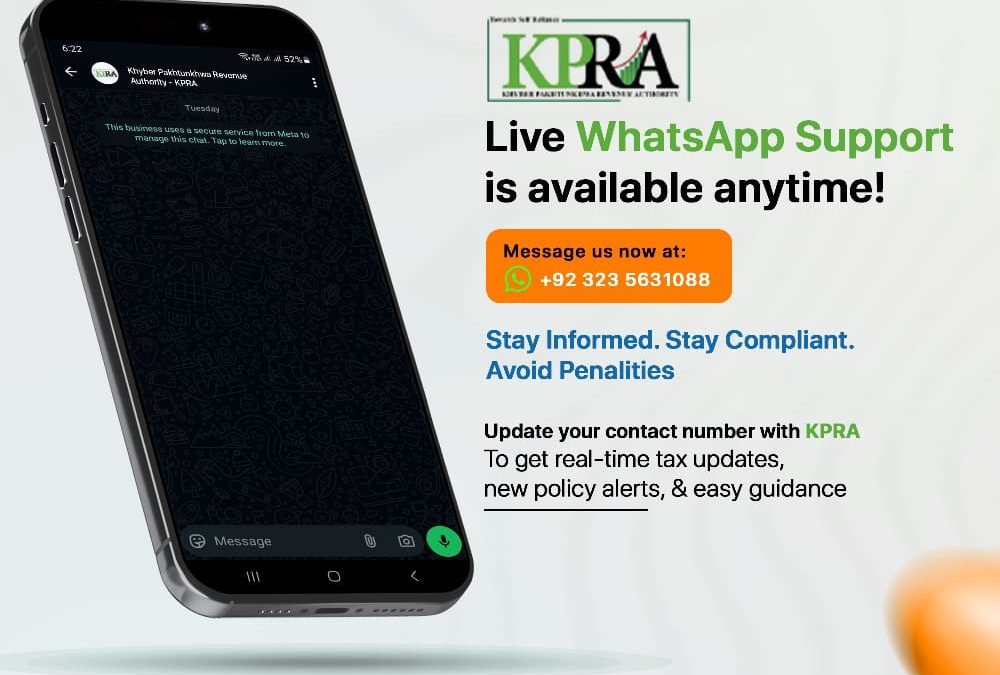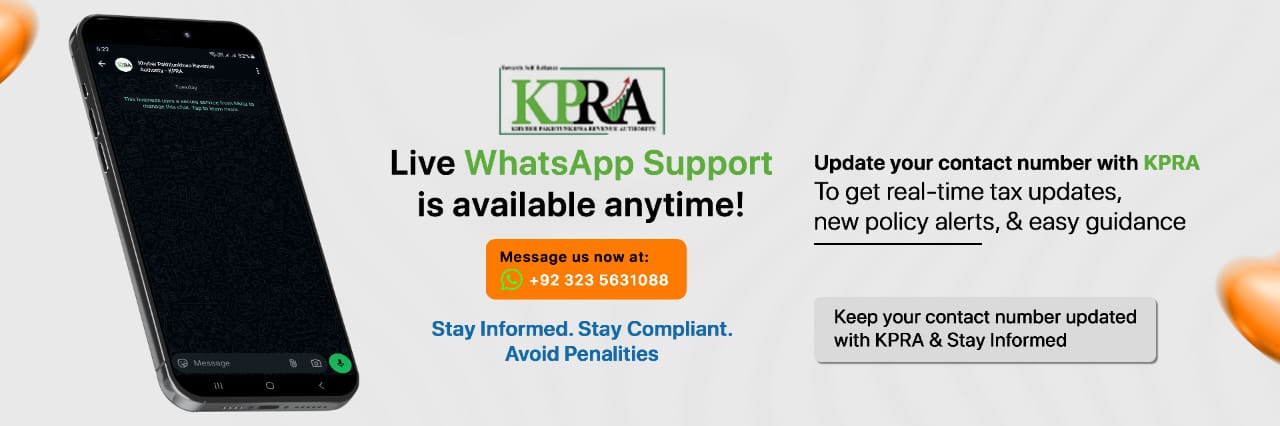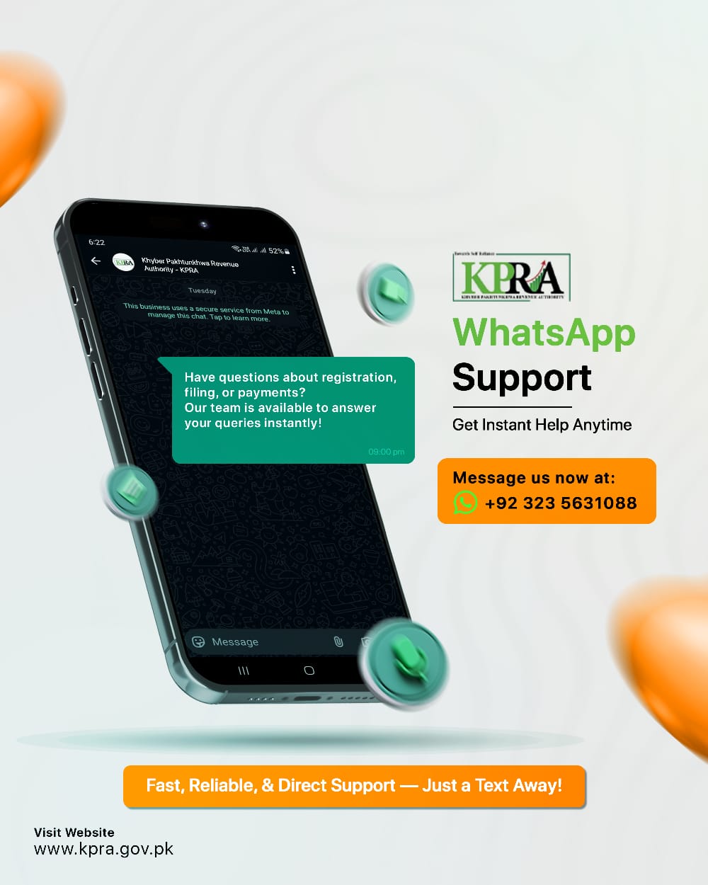 We will be sending messages to our taxpayers through the following WhatsApp number: 0323-5631088. Please save this number in your contacts and share your WhatsApp number with us on the same number to receive regular updates from Khyber Pakhtunkhwa Revenue Authority – KPRA.