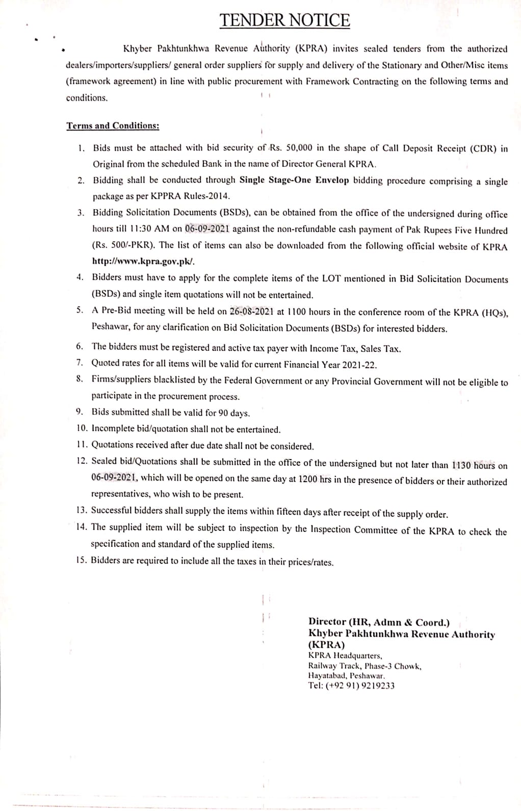 Tender Notice: KPRA invites sealed tenders from the authorized dealers/ importers/ suppliers/ general order suppliers for supply and delivery of the Stationary and Other/Misc items