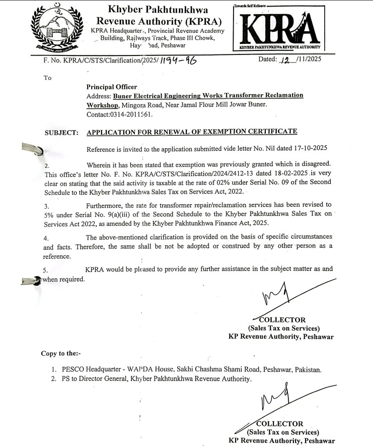 Application for Renewal of Exemption Certificate by Buner Electrical Engineering Works Transformer Reclamation Workshop, Buner