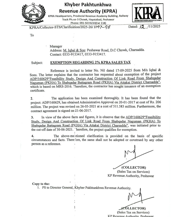 Clarification Regarding Exemption of 2% KPRA Sales Tax to M Iqbal & Sons Charsadda