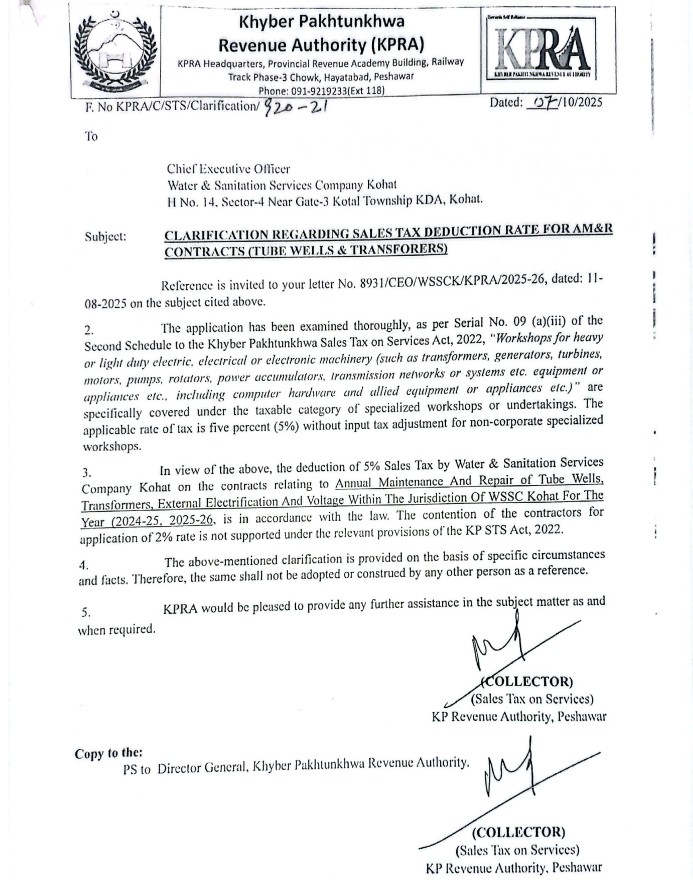 Clarification Regarding STS deduction rate for AM & R Contractors to WSSC Kohat