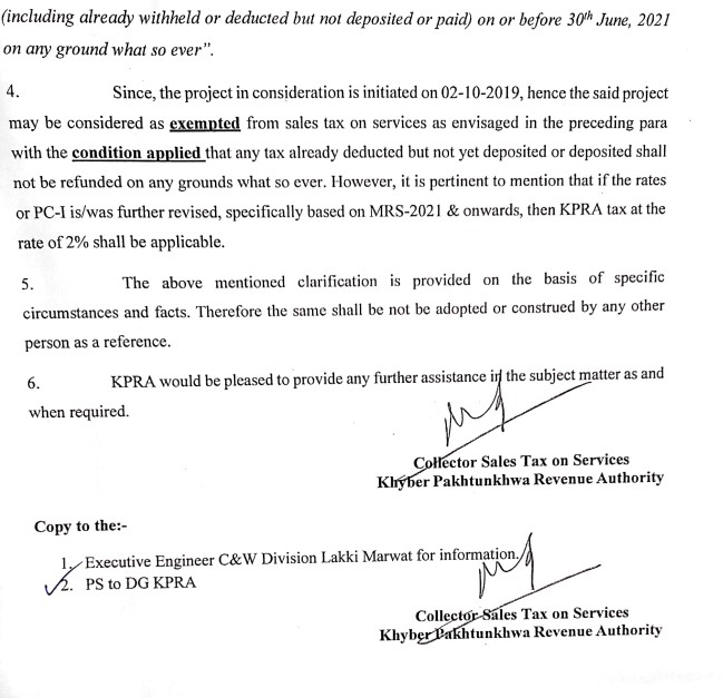 Clarification to M/S ZS Construction (Pvt) Ltd Regarding Request for Exemption of 2% of KPRA Tax