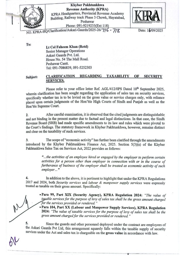 Clarification to Regarding Taxability of Security Services to Askari Guards Pvt Ltd