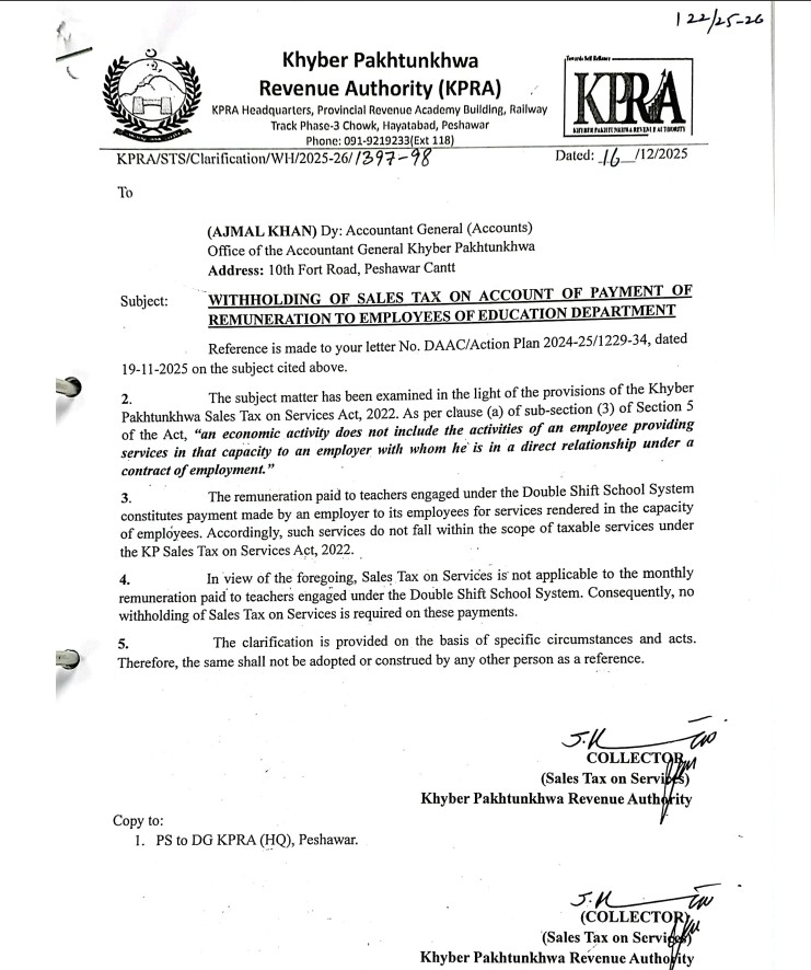 Withholding of Sales Tax on Account of Payment of Renumeration to Employees of Education Dept