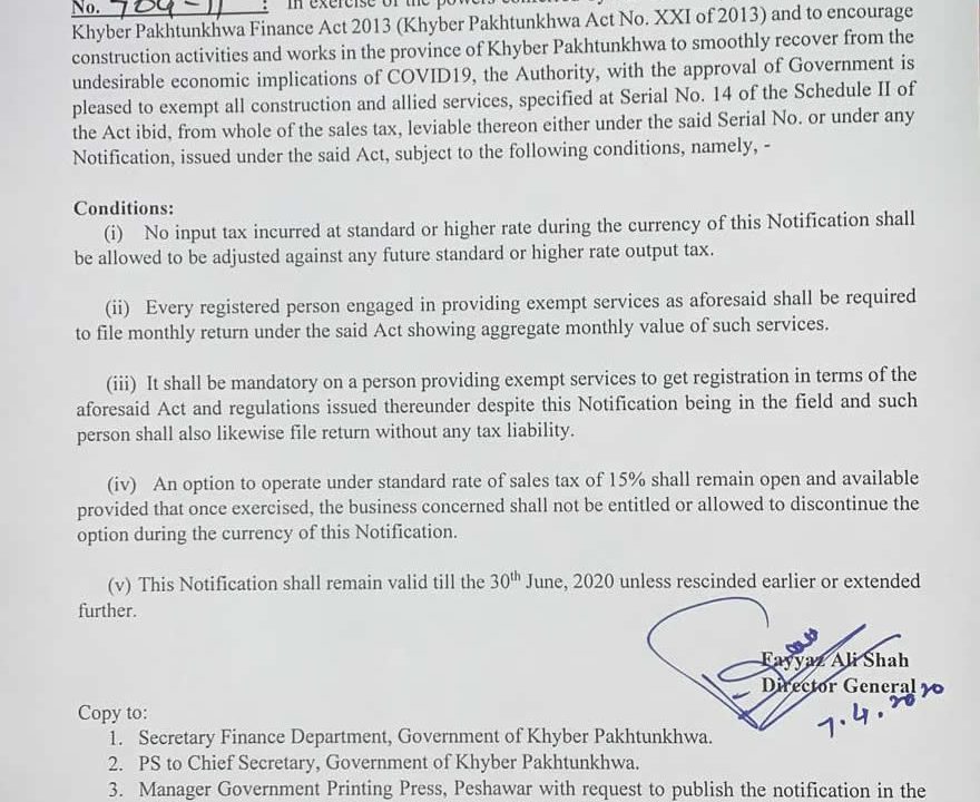 April 7, 2020Published by KPRA Administrator on April 7, 2020Categories NewsNotification: KPRA, with the approval of Government is pleased to exempt all construction and allied services, specified at Serial No. 14 of the Schedule II of KP Finance Act 2013, from whole of the sales tax, leviable thereon either under the said Serial No. or under any Notification, issued under the said Act, subject to the conditions as mentioned in below attachment.A Registration Week of KPRA, launched for taxpayers’ facilitation and tax acculturation in Khyber Pakhtunkhwa, concluded in Charsadda on Friday.